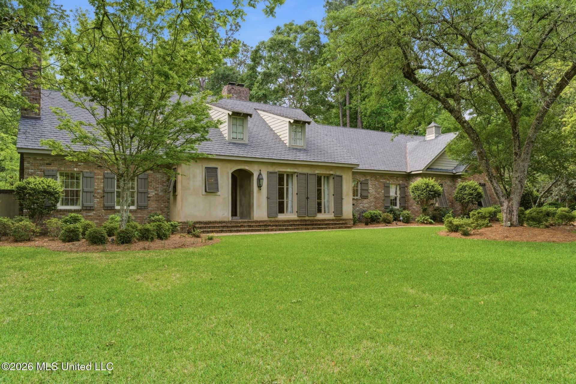 Grand French Country estate with a 600+ square foot guest house, three wood-burning fireplaces, and a park-like setting on nearly an acre in Bedford Woods! A welcoming front porch with gas lantern leads into a dramatic foyer with a curved staircase, detailed millwork, and soaring ceiling height. Inside you will find genuine heart pine floors running through much of the home along with antique wood ceilings, exposed beams, and custom built-ins that carry throughout the main living areas. The formal dining room features custom paneled walls and a wood-burning fireplace with marble tile hearth, while the main living space offers a brick arched fireplace, cypress beams, and French doors opening to the patio. The great room impresses with towering ceilings, painted cypress beams, and double French doors that bring in natural light. The kitchen is built for both scale and function with an oversized island, quartz countertops, GE Monogram gas cooktop, double ovens, SubZero refrigerator, antique farmhouse sink, and a breakfast area that opens to the backyard through French doors. A butler's pantry adds even more storage with built-ins, sink, and additional counter space. The primary suite is tucked away and offers a spacious layout with a fireplace, built-ins, and direct access to a private patio. The bathroom includes travertine flooring, a custom walk-in shower with dual shower nozzles, and a large walk-in closet with built-ins and an island. Upstairs, a wide landing leads to additional bedrooms and baths, including a Jack and Jill layout with quartz vanities and walk-in closets. There is also a dedicated office space with built-ins and a large playroom with extensive storage and workspace areas. The outdoor setting is just as impressive. The backyard is fully fenced and designed for both privacy and usability with brick walkways, a covered porch, wall fountain, and mature landscaping. A separate guest house adds incredible flexibility with Chicago brick floors, two closets, a full bath, and kitchenette with antique sink and concrete countertops. Additional highlights include a 3-car garage with electric car plug, workshop, in-ground sprinkler system, and major system updates including a roof replacement and HVAC with UV light air cleaning system . This is a rare opportunity to own a truly distinctive home with character, scale, and craftsmanship in one of Hattiesburg's most established neighborhoods. Schedule your private viewing today!